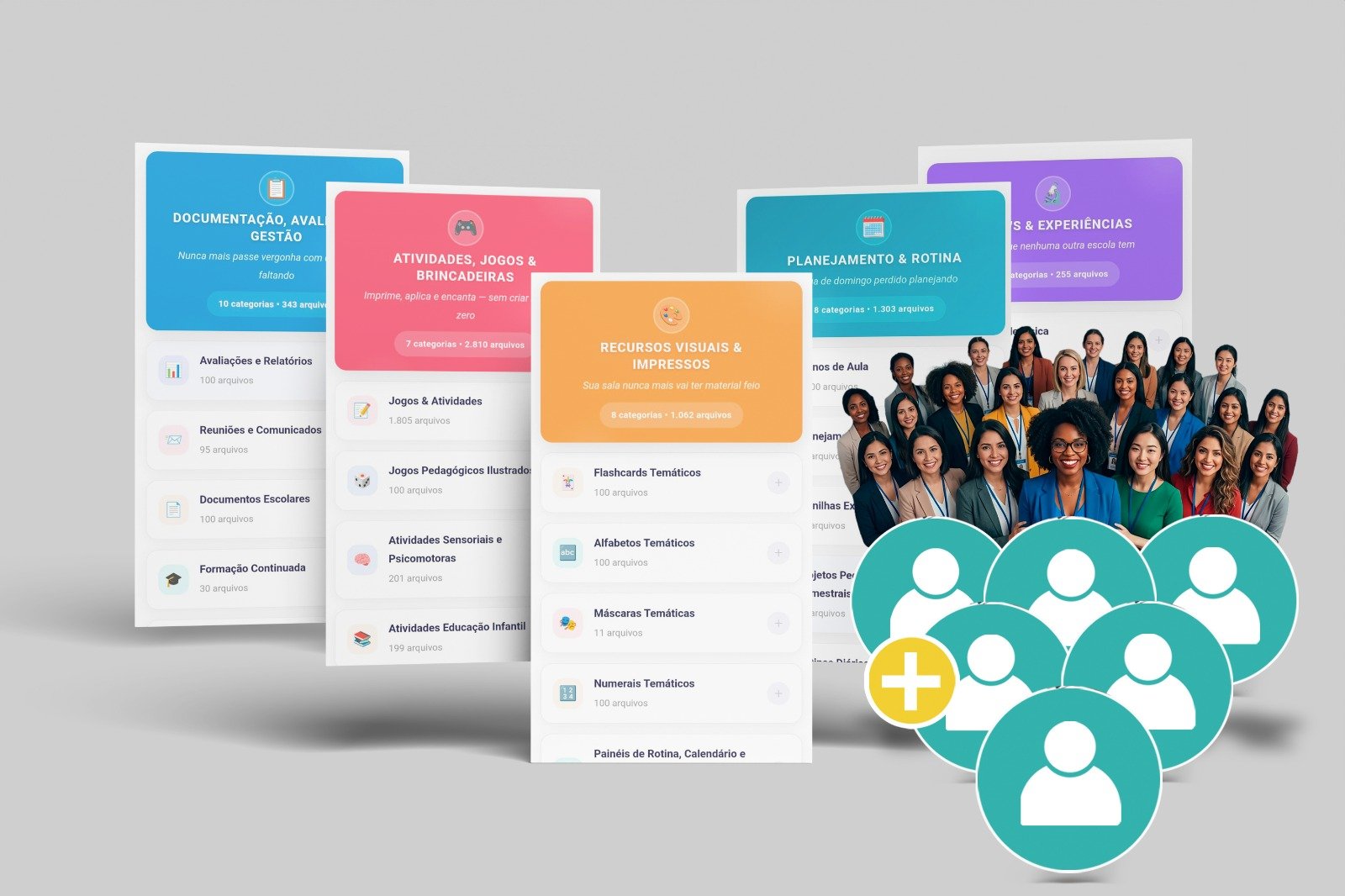 Plano completo para toda a equipe pedagógica. Acesso ilimitado à Biblioteca KidFly com mais de 7.400 materiais editáveis, 100% alinhados à BNCC. Logins simultâneos ilimitados. Inclui o Sistema de Gestão Escolar Completo grátis com relatórios, matrículas e controle administrativo (disponível a partir de 30/06/2026).